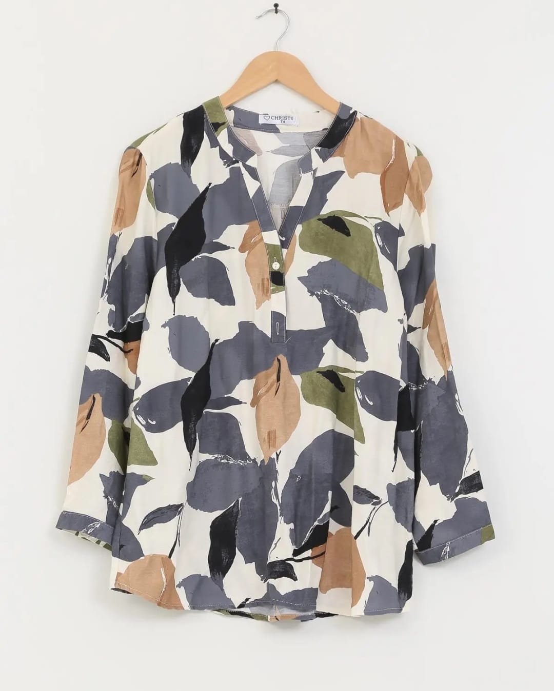 Cette blouse à manches longues se pare d'un imprimé artistique mêlant des formes et des nuances de gris, de camel et de vert olive sur un fond crème lumineux