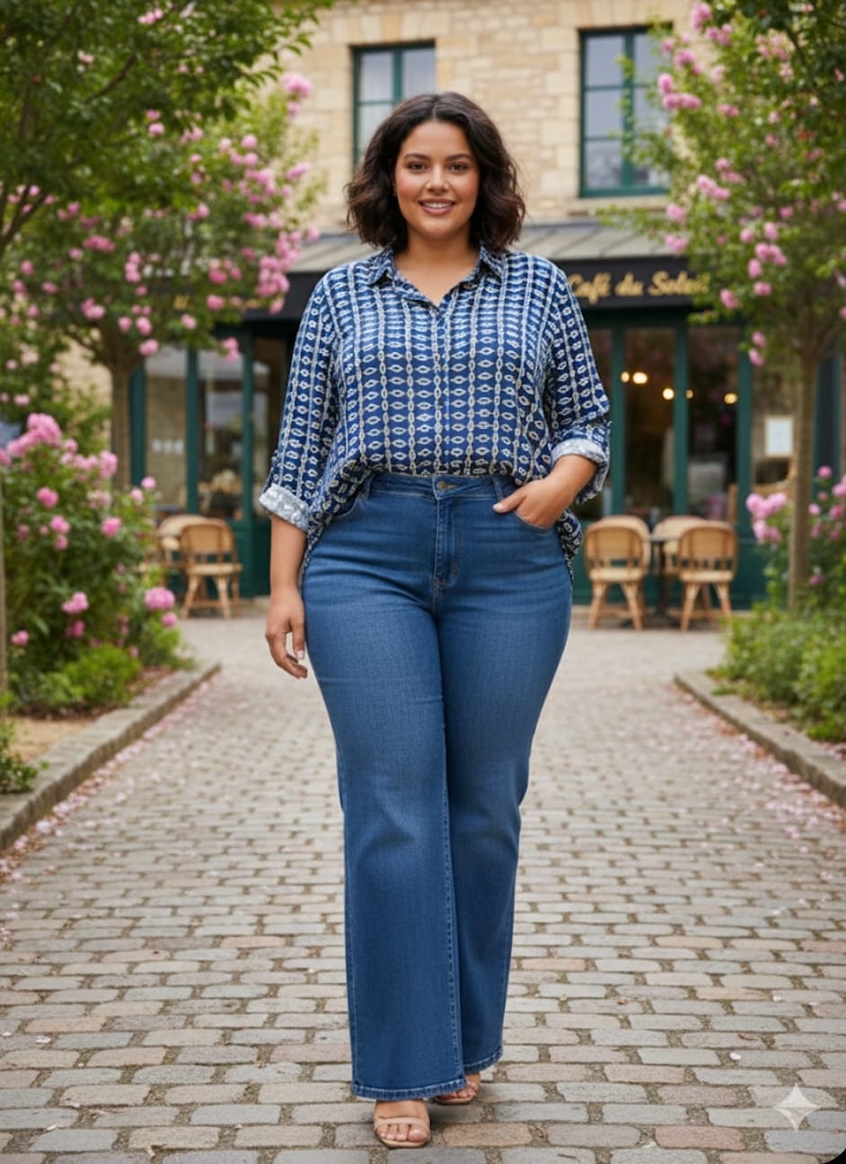 Cette chemise fluide arbore un imprimé géométrique crème sur un fond bleu profond, créant un motif en chaîne vertical qui allonge la silhouette