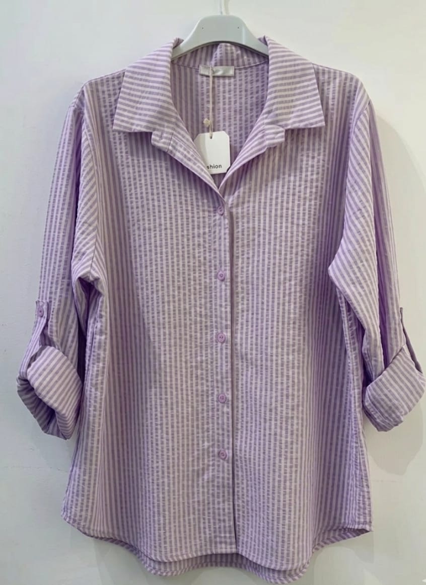 Ce chemisier élégant combine la douceur des coloris avec un jeu de rayures verticales subtilement texturées