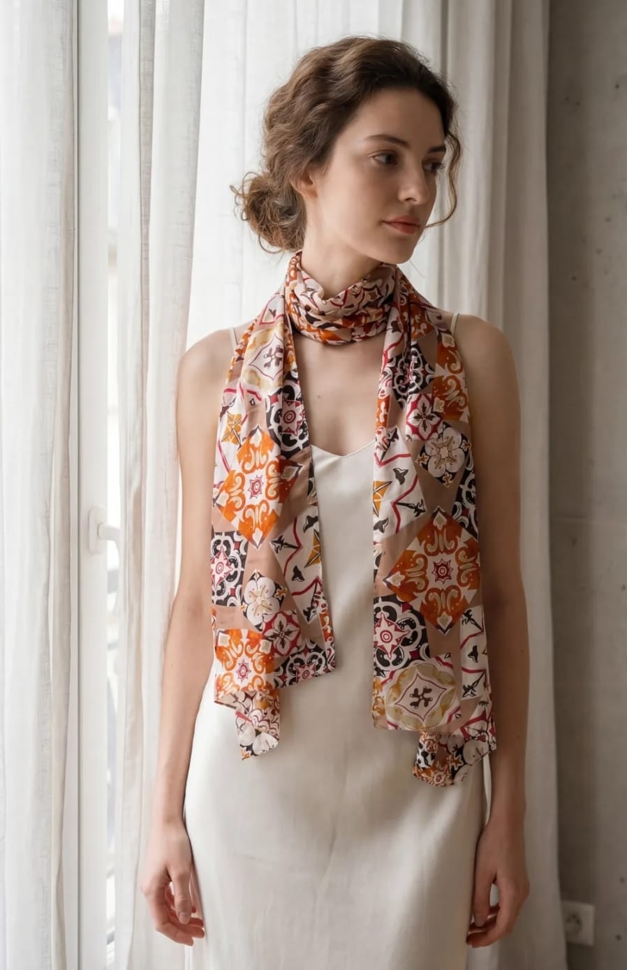 Sublimez votre style avec ce foulard aux inspirations méditerranéennes et aux motifs géométriques raffinés