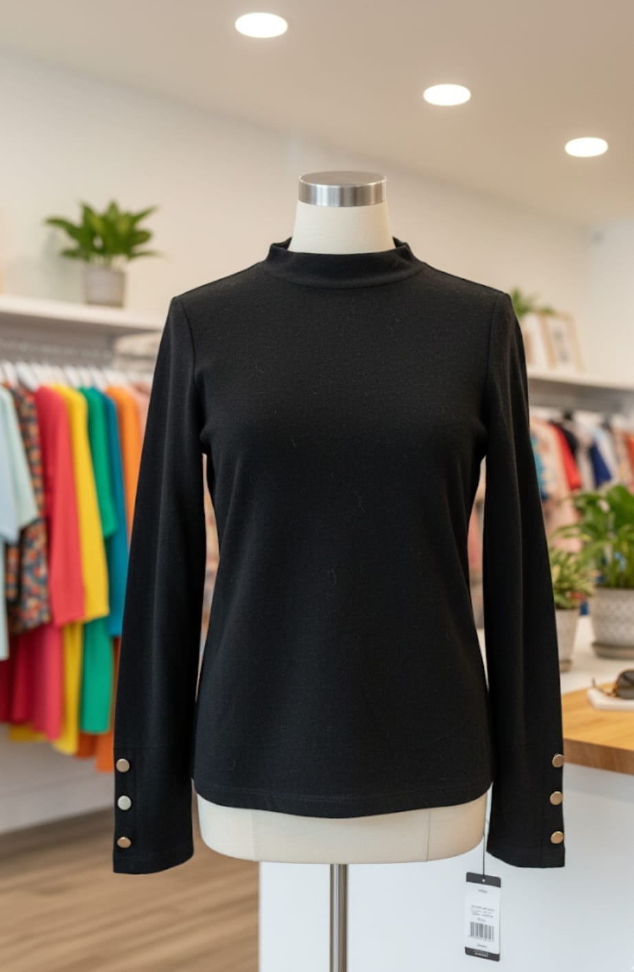 Ce basique se démarque grâce à des détails ultra-chics : une rangée de boutons décoratifs dorés 💛 orne les poignets, apportant une touche de luxe et de sophistication
