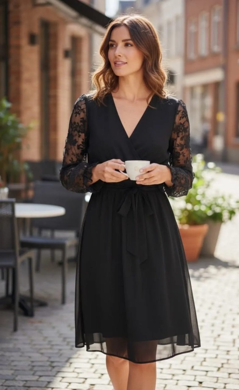 L'élément distinctif réside dans les manches longues en dentelle transparente à motif floral, qui ajoutent une touche de féminité et de mystère