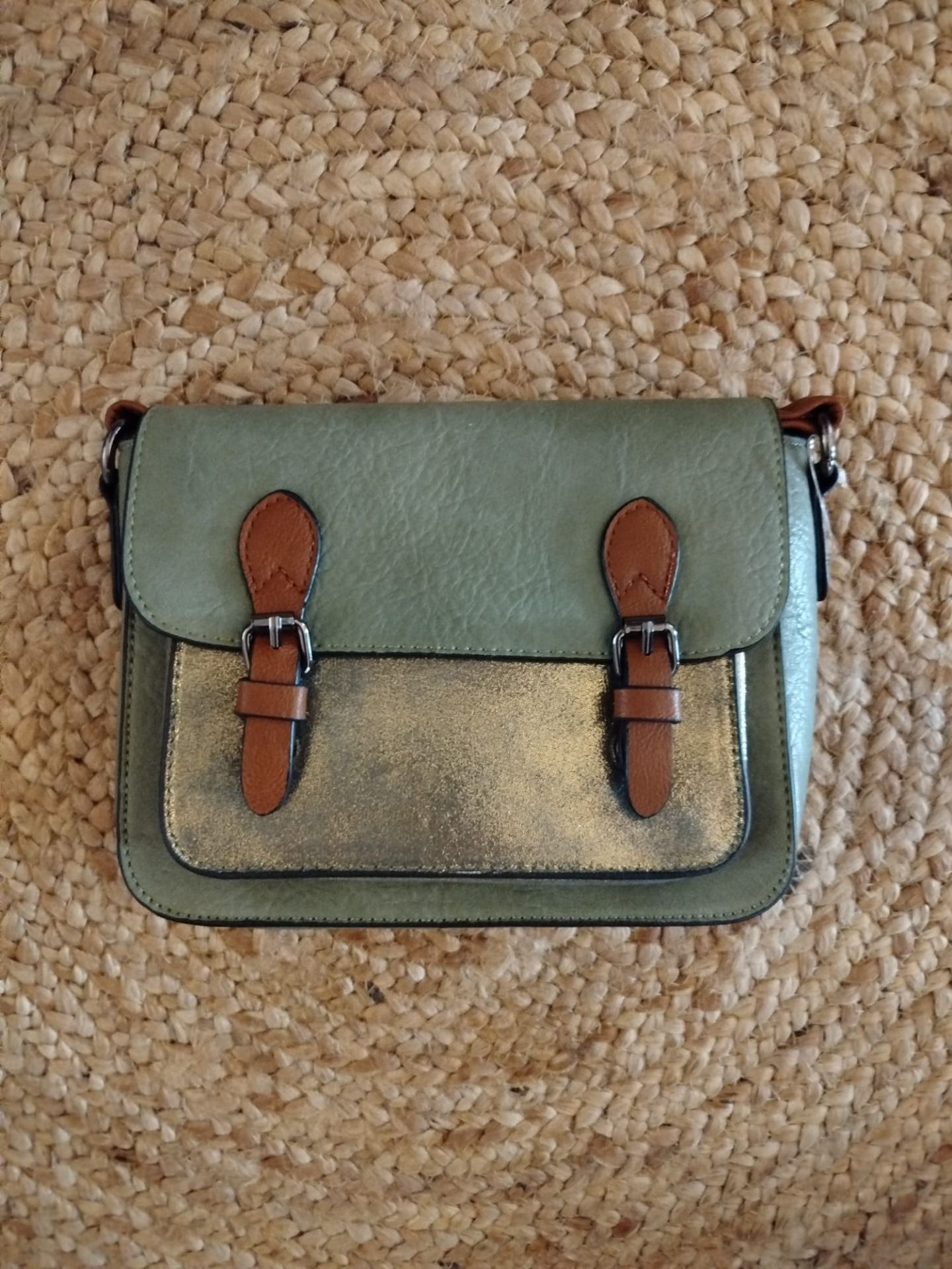 La partie principale du sac et le rabat sont en simili-cuir grainé vert amande