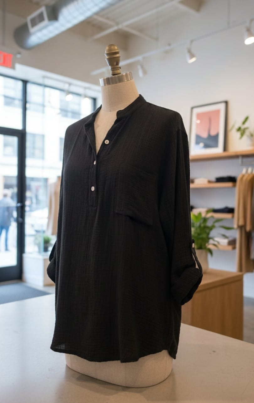 La matière en gaze de coton respirante et légère qui ne nécessite pas de repassage pour un look naturellement froissé
