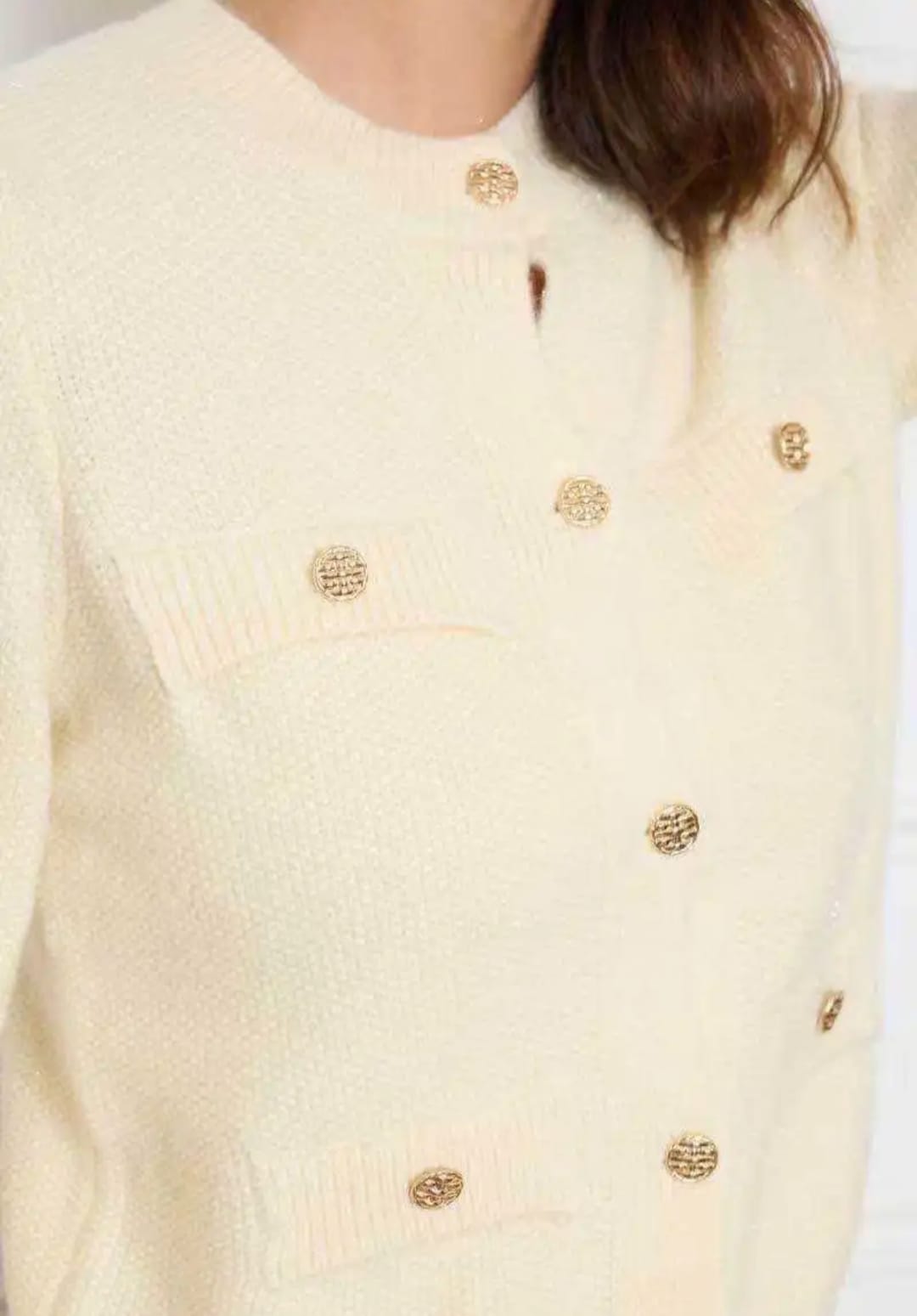 Le contraste raffiné entre la maille brillante et l'éclat des boutons dorés qui apporte une touche de luxe immédiate