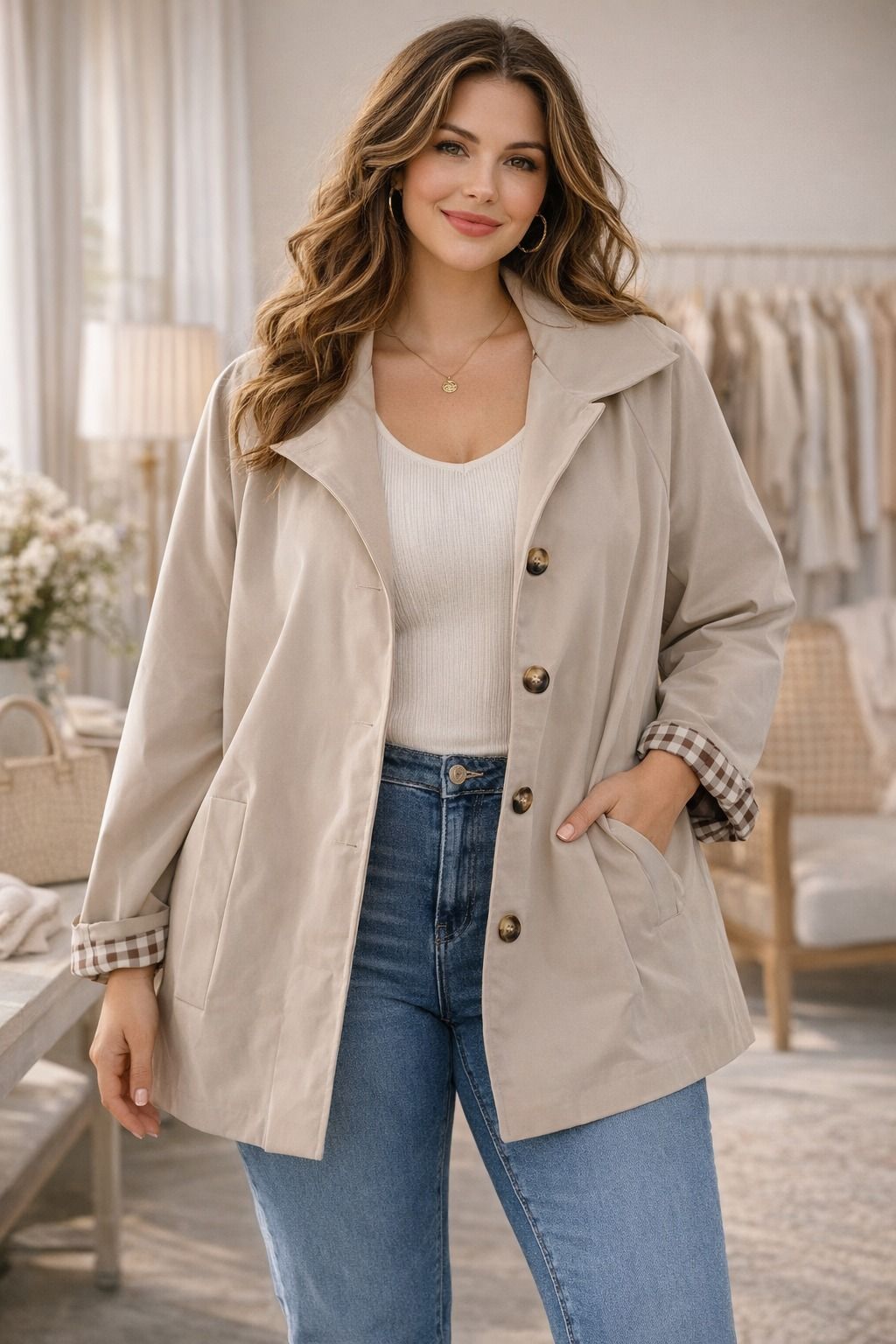 Veste Mi-Saison Beige "Élégance Vichy"