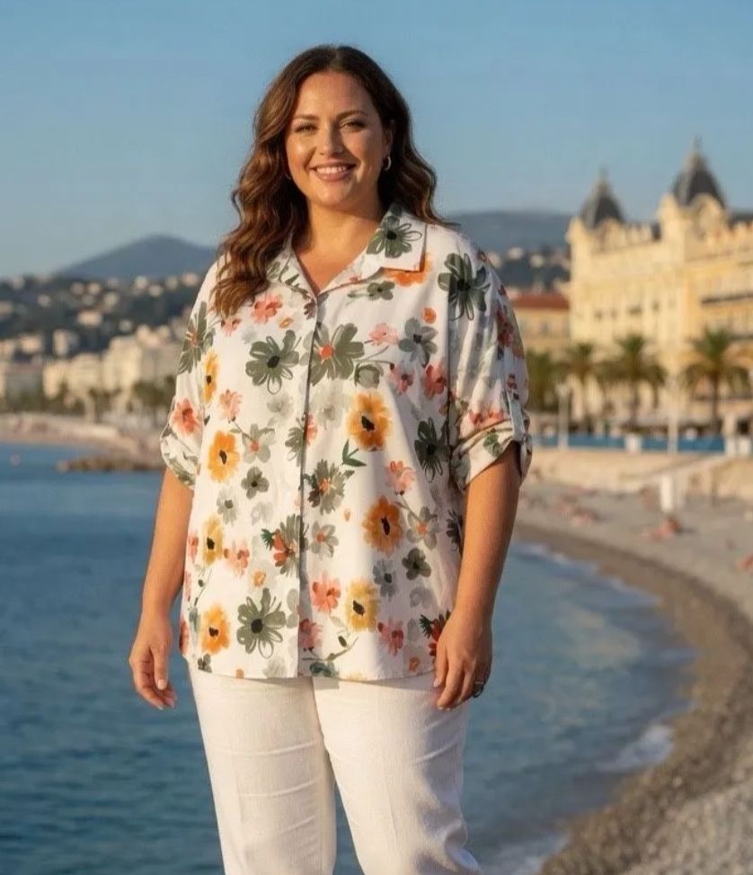Pour un look harmonieux, associez ce haut imprimé à un bas uni de couleur neutre (blanc, beige ou denim) afin de laisser l'imprimé floral être la star de votre tenue 🌸☀️