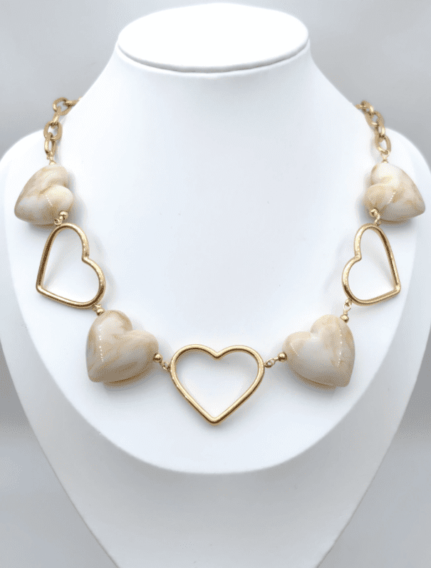 Ce collier unique combine des cœurs bombés à l'effet marbré avec des pendentifs cœurs évidés en métal doré