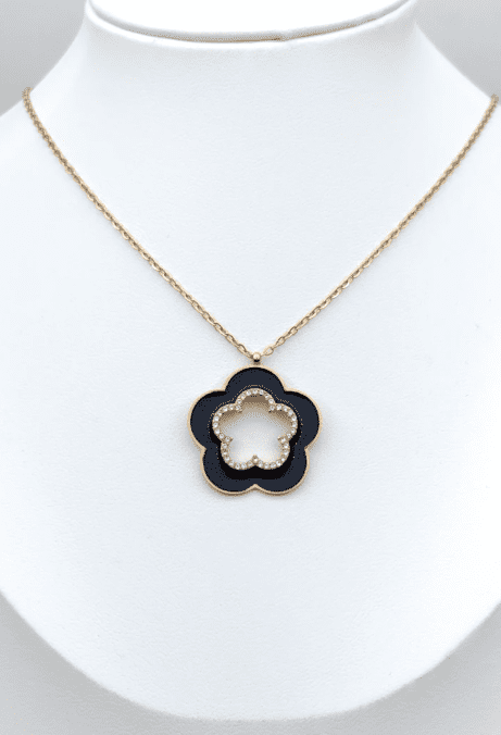 Son pendentif est une élégante fleur à cinq pétales, mêlant la profondeur du noir à un contour orné de micro-strass brillants ✨