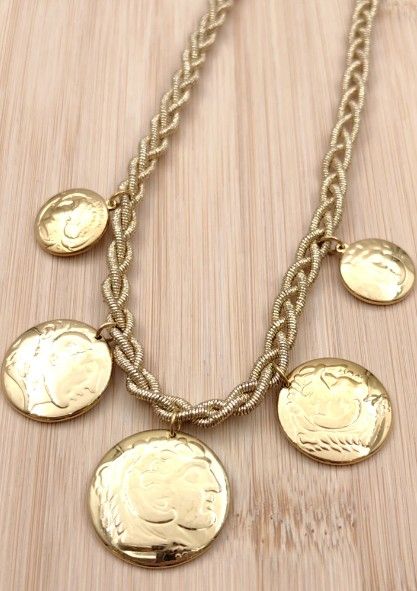 Ce collier de style vintage en acier inoxydable d'une belle finition dorée se compose d'une chaîne torsadée ornée de plusieurs médaillons ronds