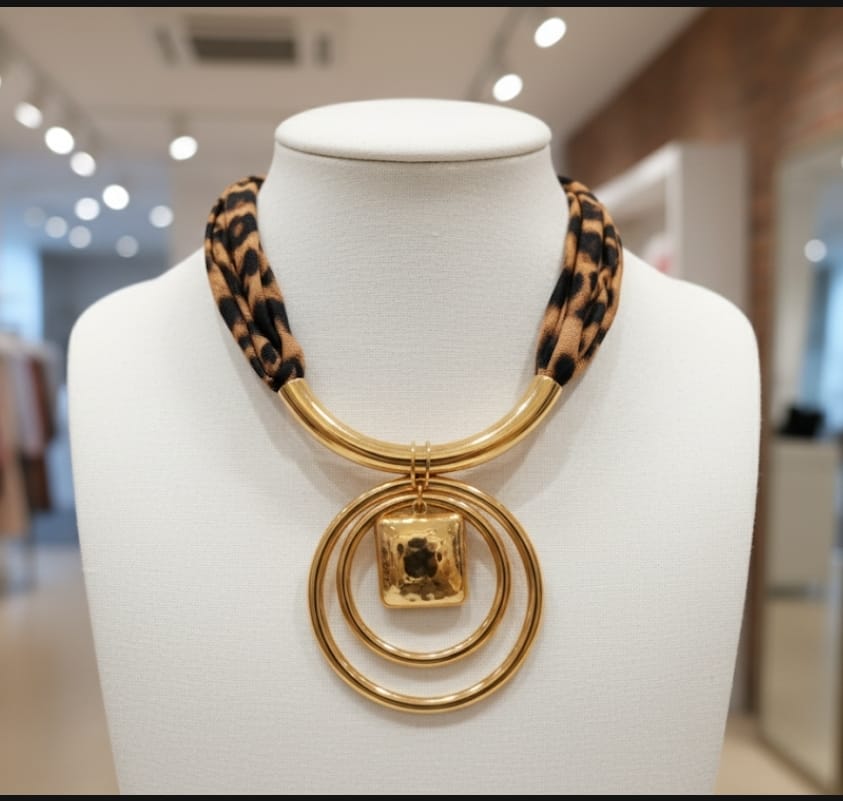 Il combine un double cordon à motif léopard pour un côté sauvage et tendance, avec un pendentif géométrique et imposant composé d'anneaux et d'un carré doré