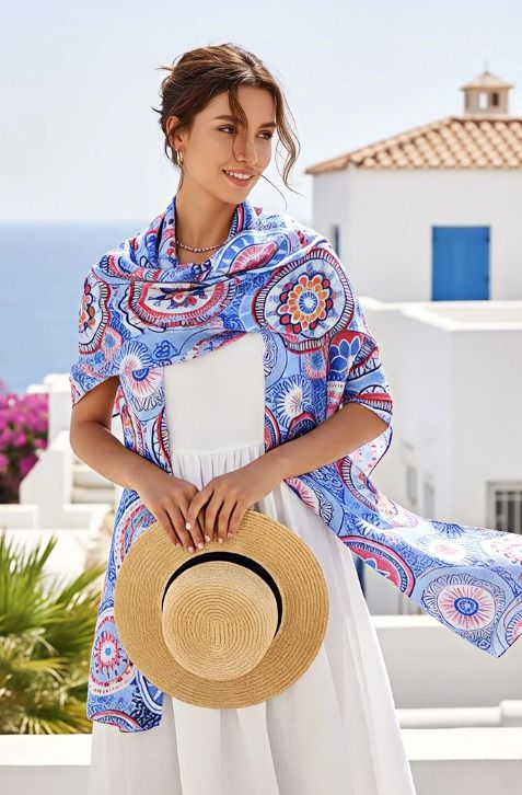 Ce foulard propose un mélange captivant de motifs circulaires façon mandalas et de rosaces colorées