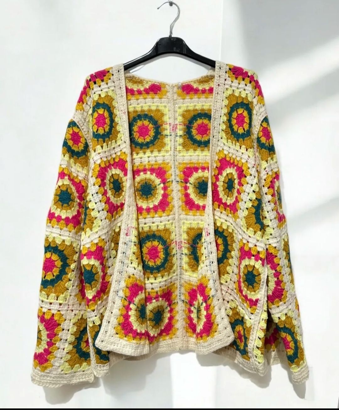 Ce gilet présente un assemblage complexe de carrés de crochet aux motifs géométriques