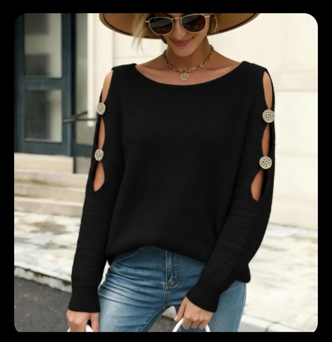 Pull Noir Chic – Manches Ouvertes et Boutons Dorés