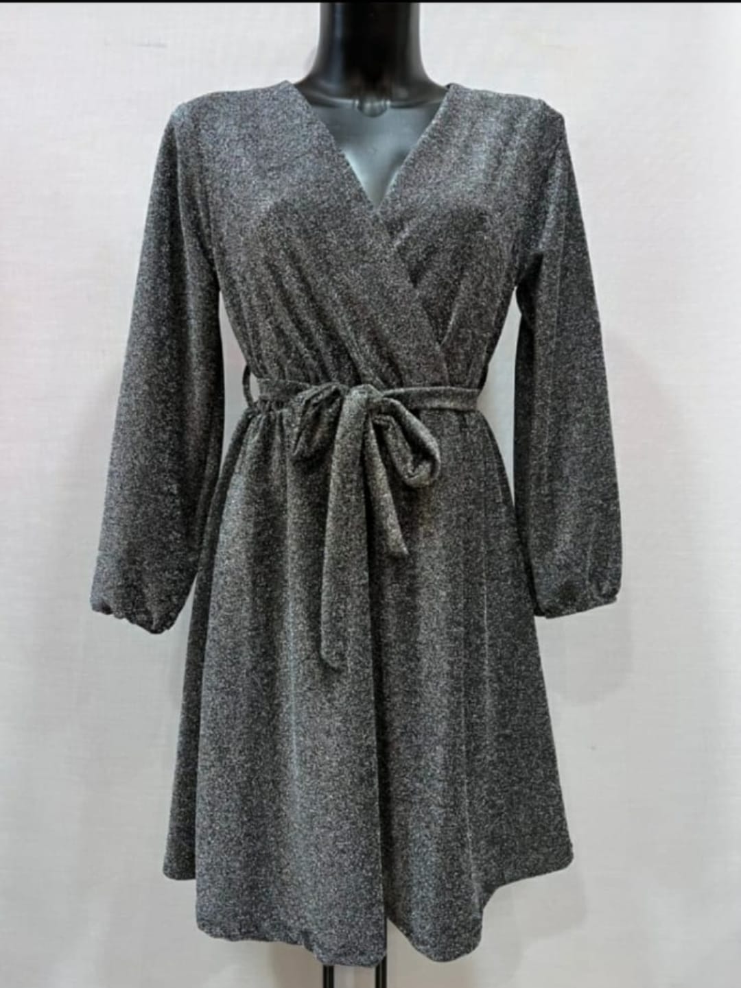 Cette robe est une merveille de style, avec un tissu gris parsemé de fils scintillants pour un effet lumineux et chic ✨