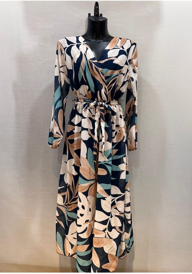 Sa coupe avec son décolleté en V met en valeur la silhouette avec raffinement, tandis que la taille marquée par une ceinture à nouer crée une allure gracieuse et féminine.