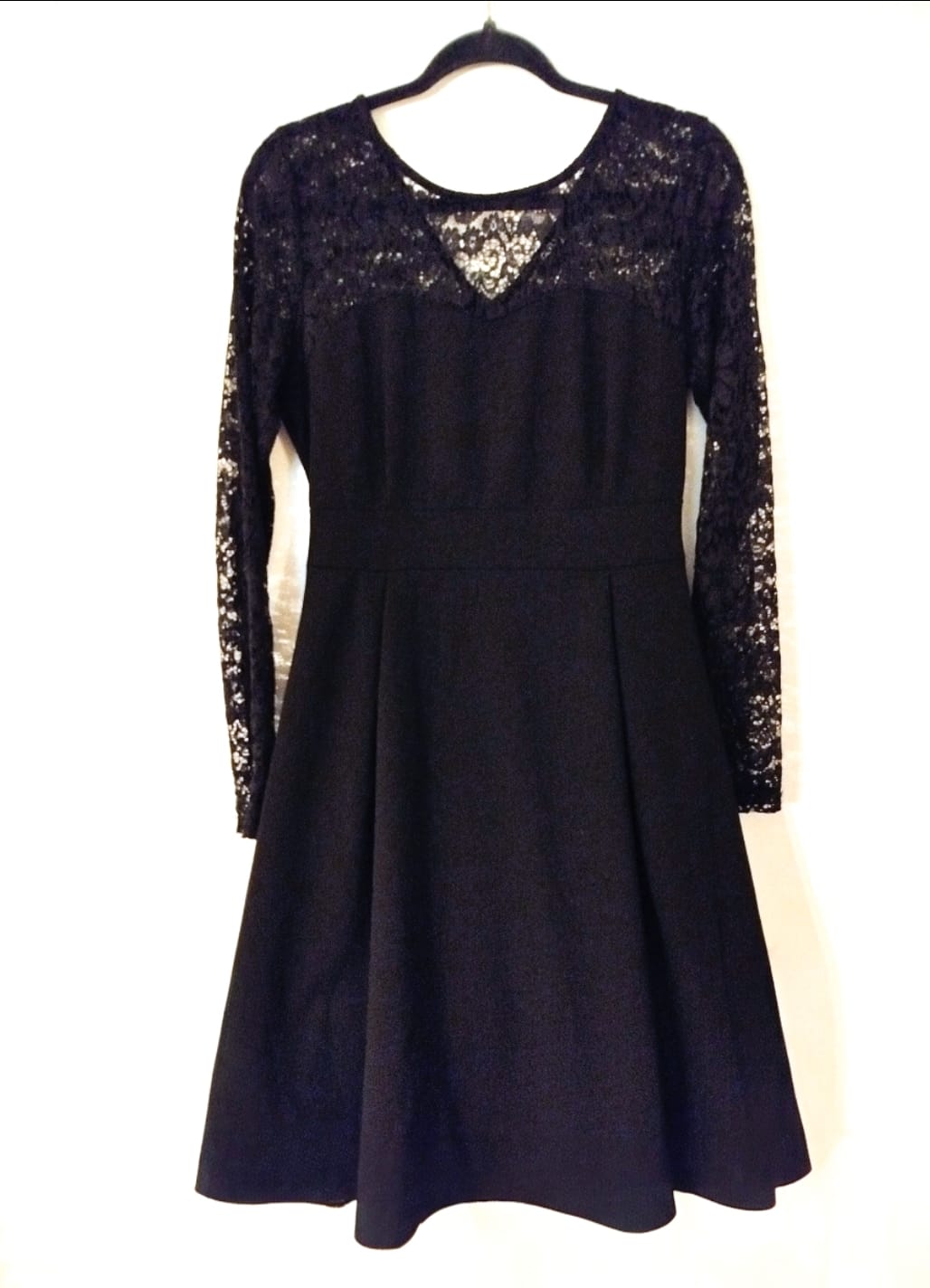 Cette robe noire élégante se distingue par son bustier et ses manches longues entièrement confectionnés dans une dentelle florale délicate qui joue sur la transparence