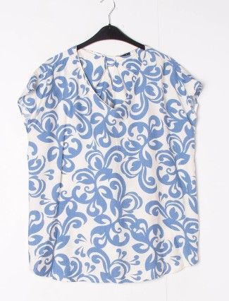 Adoptez la légèreté et l'élégance avec notre top fluide aux motifs bleu sur un fond blanc cassé