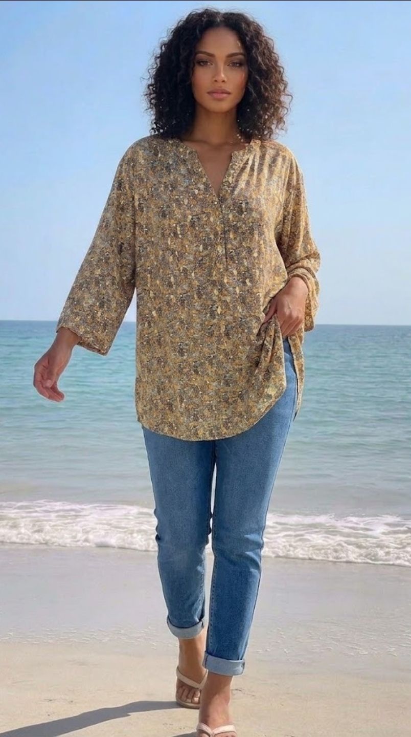 Une tunique ample et fluide au décolleté en V, parfaite pour un look bohème-chic ou rétro